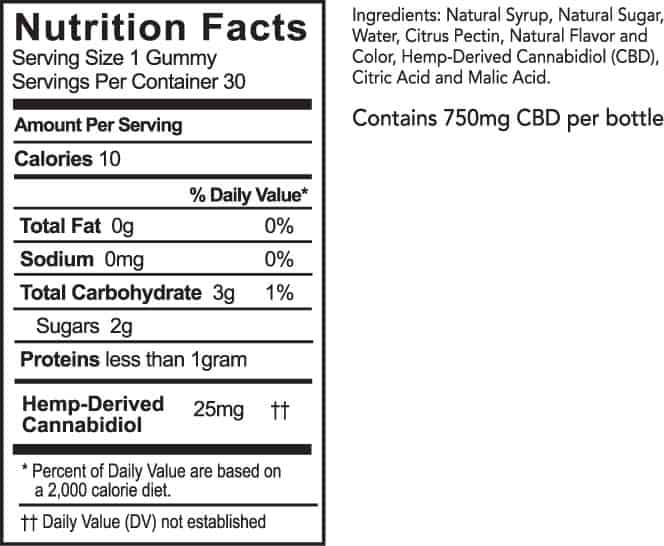 Natural Syrup, Natural Sugar, Water, Citrus Pectin, Natural Flavor and Color, Hemp-Derived Cannabidiol (CBD), Citric Acid and Manic Acid